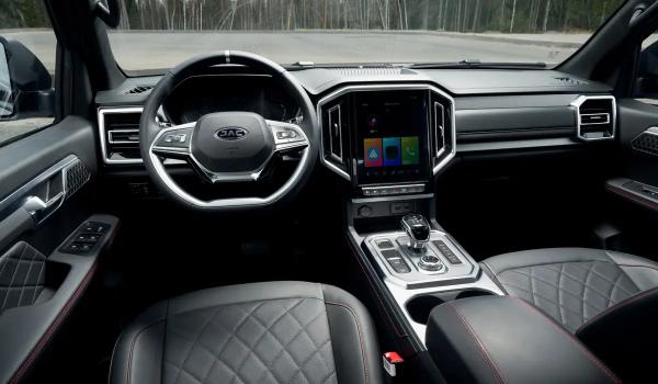 Одно из важнейших отличий пикапа ST9 от младших собратьев это полностью оригинальный салон с установленным по центру вертикальным сенсорным дисплеем мультимедийной системы (10,4-дюймов). Перед водителем установлен трехспицевый руль и экран с виртуальными приборами под козырьком.